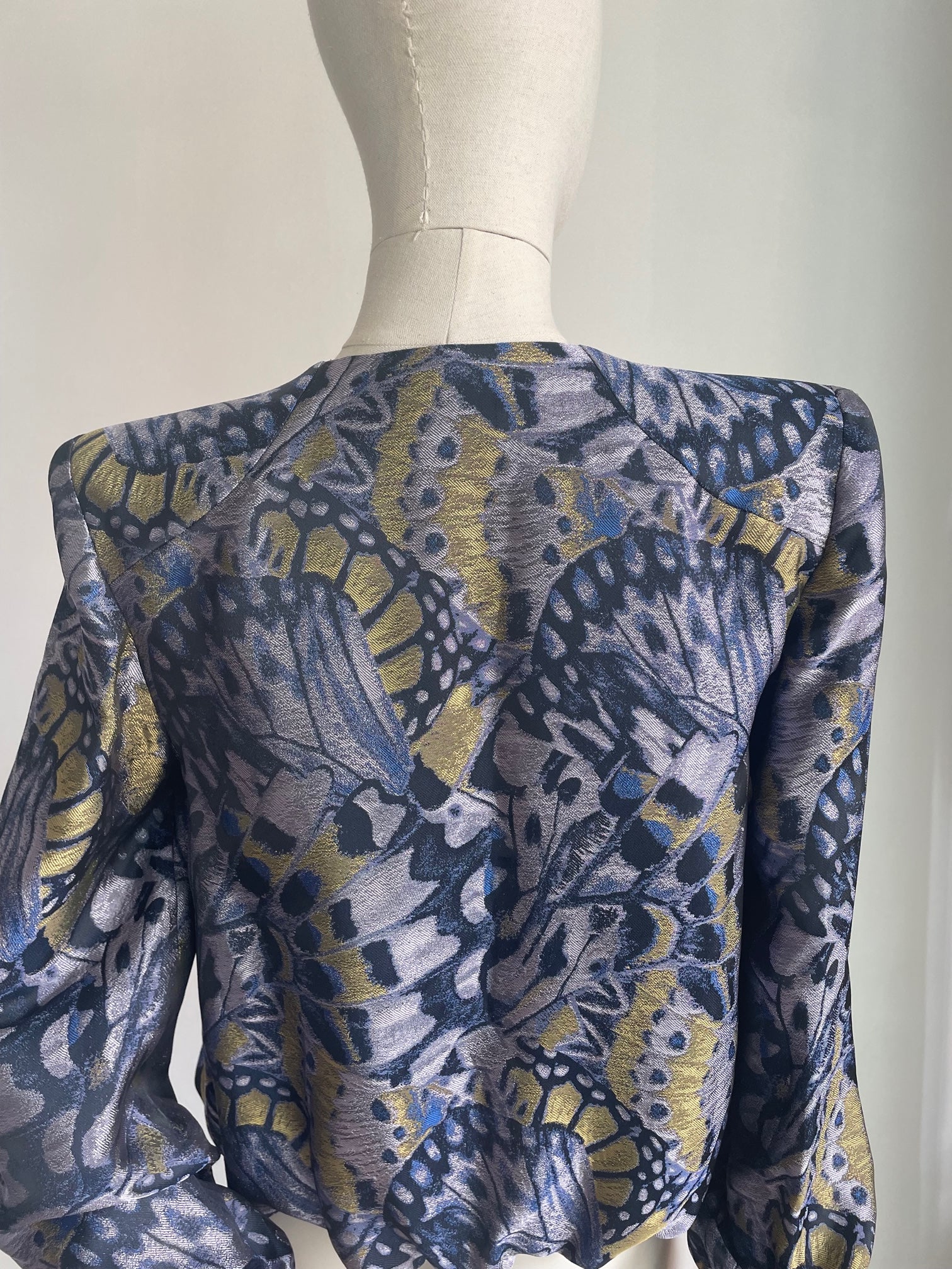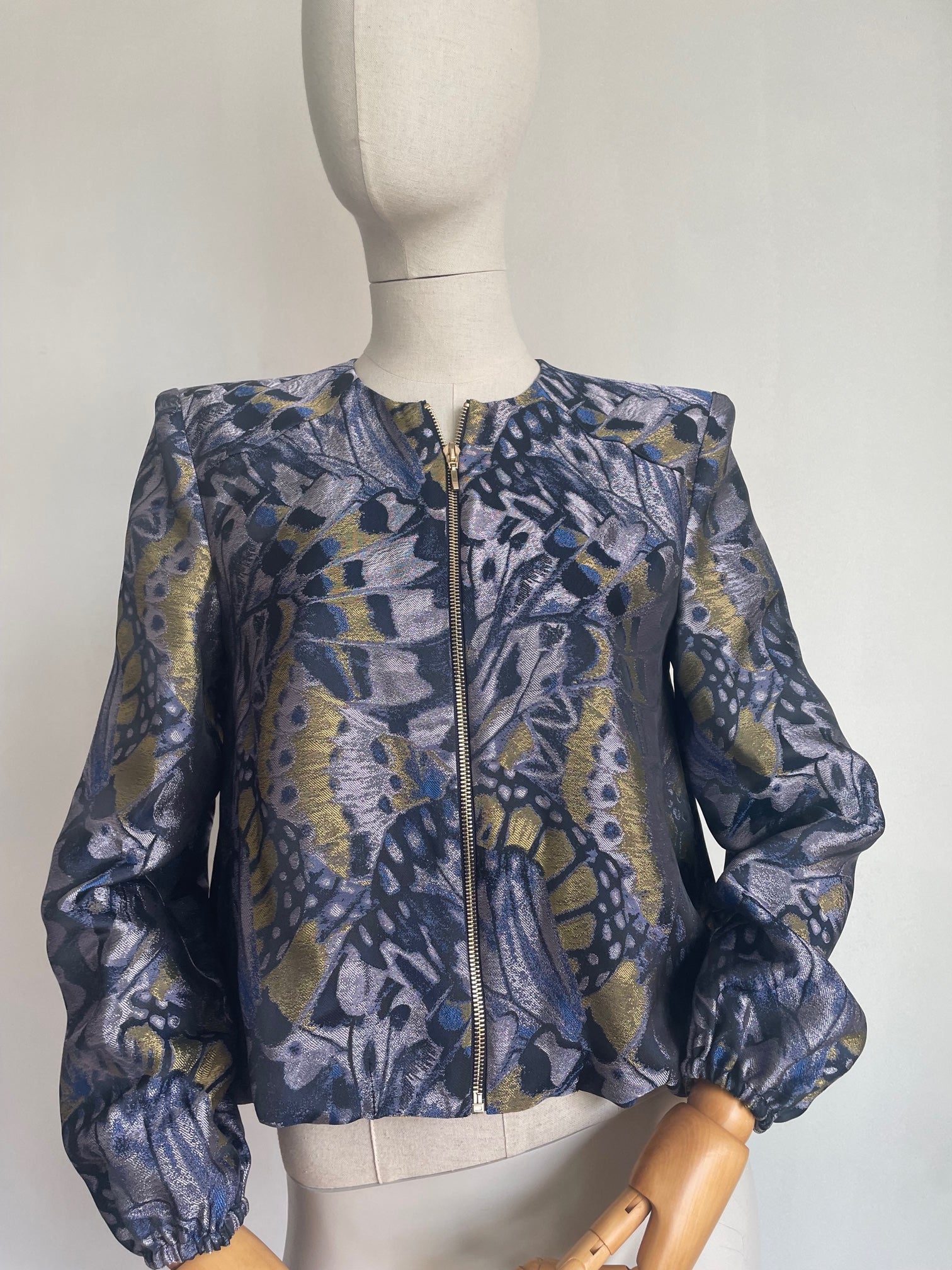 Diseño confeccionado en un estampado de jacquard, aportando comodidad y libertad de movimiento. Tiene un corte bomber con una cremallera metalizada dorada. Hombreras marcadas y mangas abombadas con elastico en el puño. Terminación con una patente elástica. Ideal para sumar un toque único a tu estilo