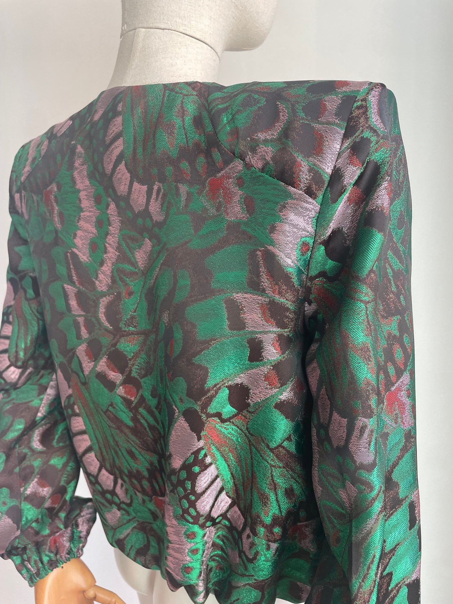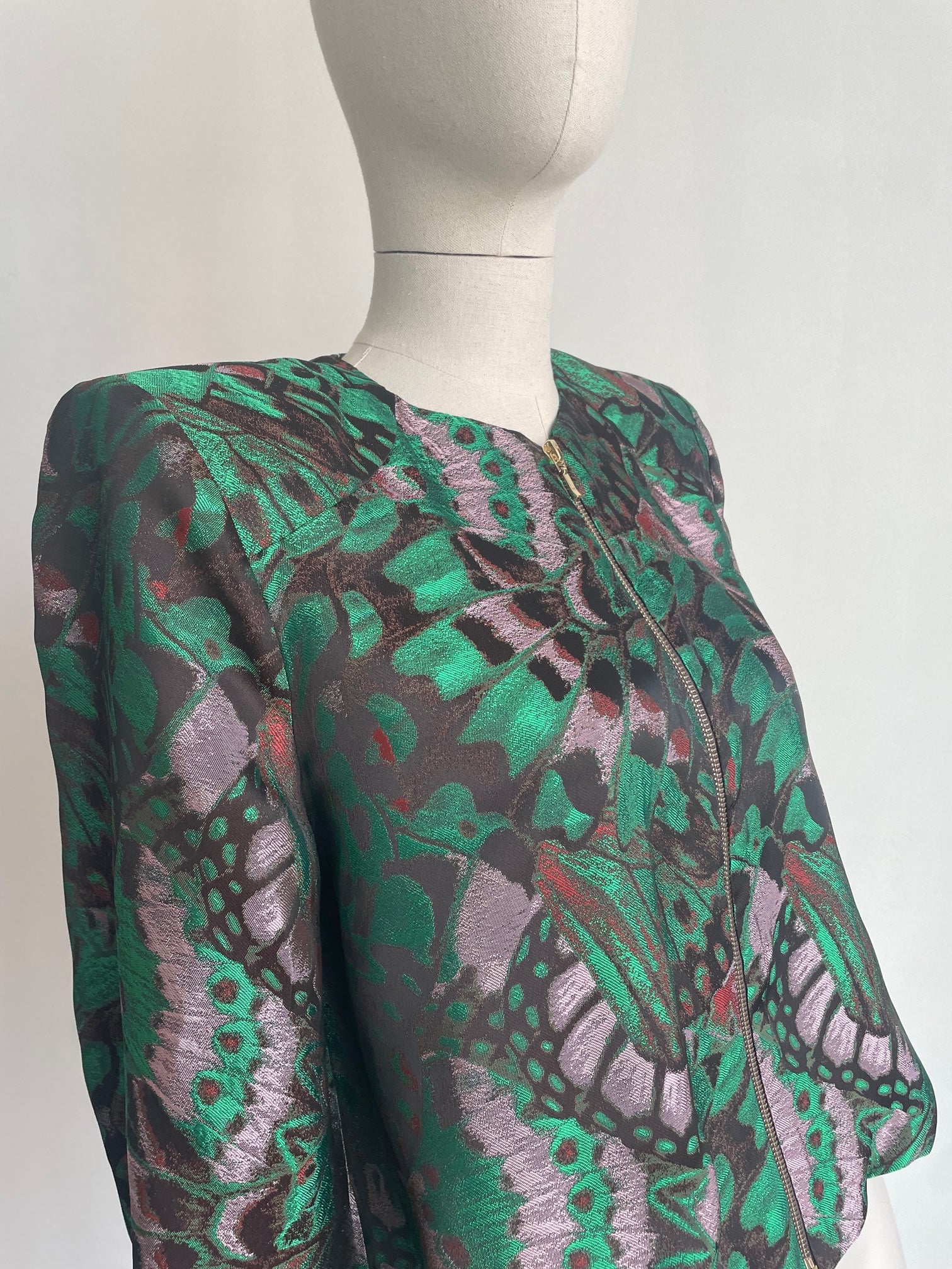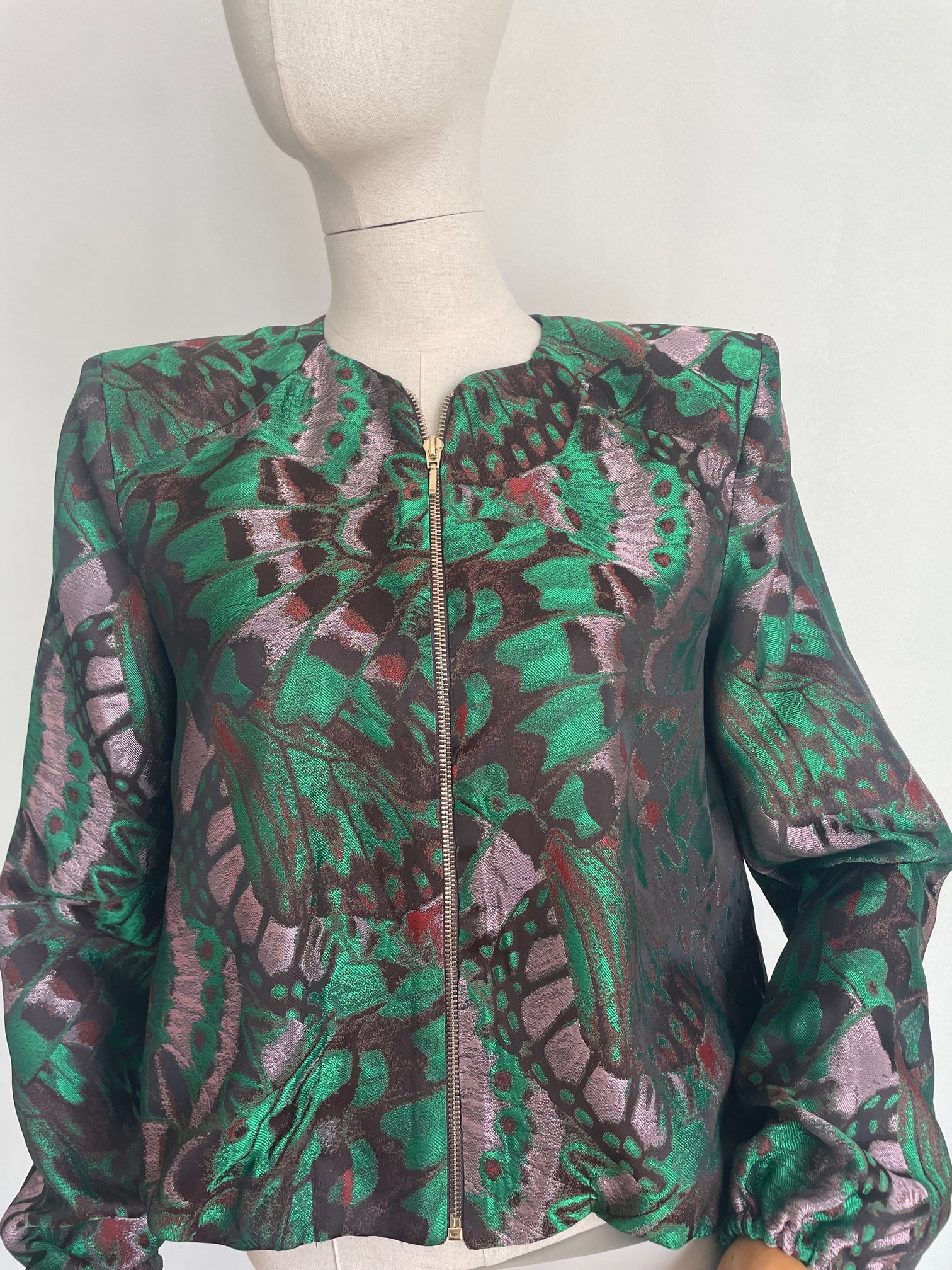 Diseño confeccionado en un estampado de jacquard, aportando comodidad y libertad de movimiento. Tiene un corte bomber con una cremallera metalizada dorada. Hombreras marcadas y mangas abombadas con elastico en el puño. Terminación con una patente elástica. Ideal para sumar un toque único a tu estilo