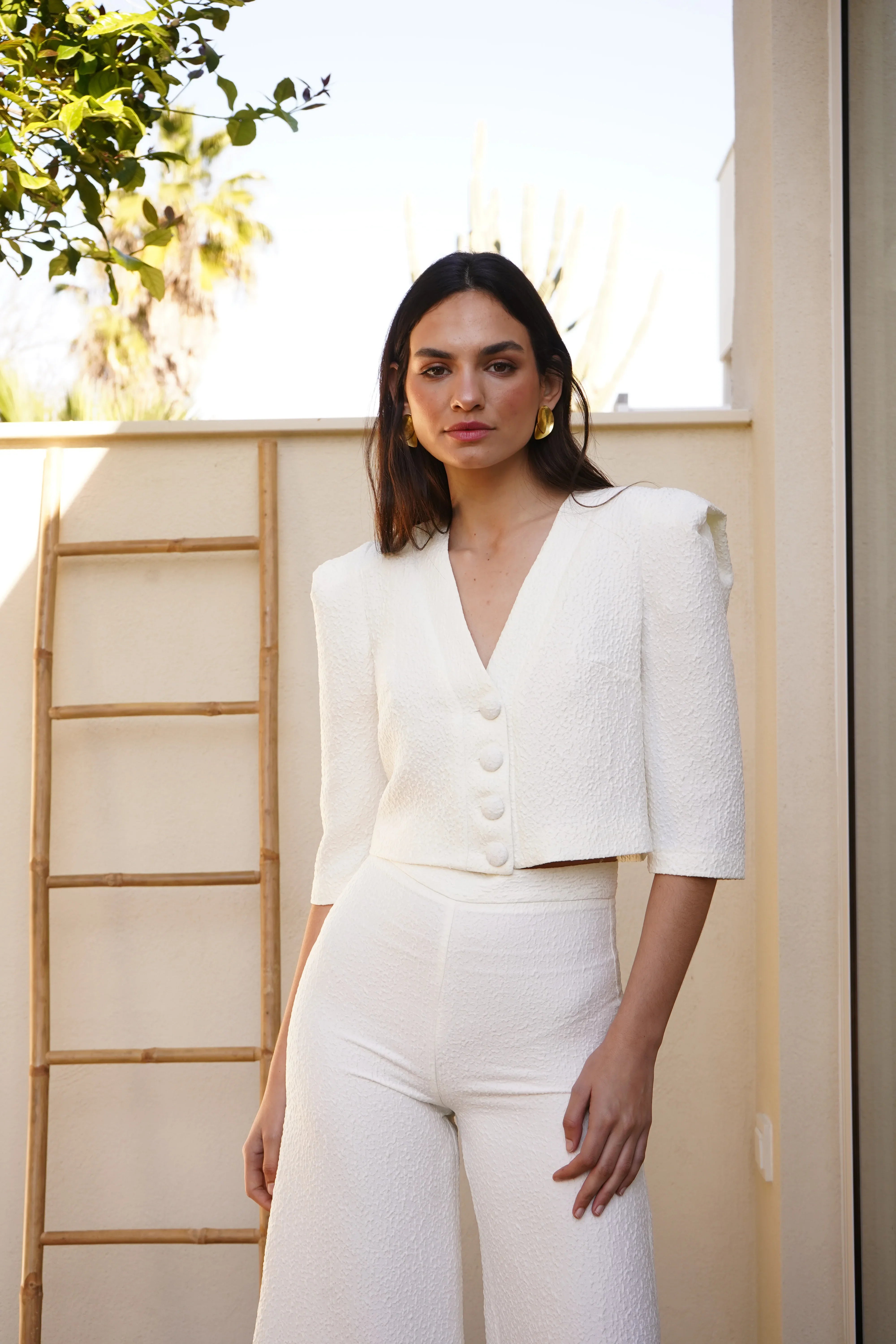 Conjunto dos piezas BISELL confeccionado en jacquard algodón. Este increíble dos piezas esta formado por una chaqueta de corte medio y un pantalón estilo culotte. La chaqueta es la joya de este dos piezas, destaca por sus hombreras marcadas y su escote en V. El pantalón ayuda a estilizar la figura por la parte de la cintura y a dar estructura gracias a su estilo acampanado. Este conjunto es un fondo de armario infalible para eventos.