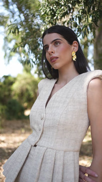 Conjunto de dos piezas GENE confeccionado en jacquard Chanel. El peplum es el centro de atención del look, su cinturilla ajustada, sus hombreras marcadas y su escote en V son la combinación perfecta. El volante del peplum proporciona volumen, estructura y movimiento a la prenda. La pieza consta de tres botones frontales forrados del mismo tejido. La combinación de la falda de corte midi con abertura posterior aporta naturalidad a este elegante dos piezas. Una elección de lo más acertada para cualquier evento esta primavera-verano.