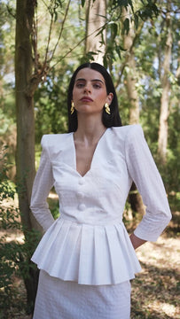 Conjunto de dos piezas AVA confeccionado en vichy. El péplum es el centro de atención del look, su cinturilla ajustada, sus hombreras marcadas y su escote en V son la combinación perfecta. El volante del péplum proporciona volumen, estructura y movimiento a la prenda. La combinación de la falda midi con abertura posterior aportan naturalidad a este elegante dos piezas. Una elección de lo más acertada para cualquier evento.