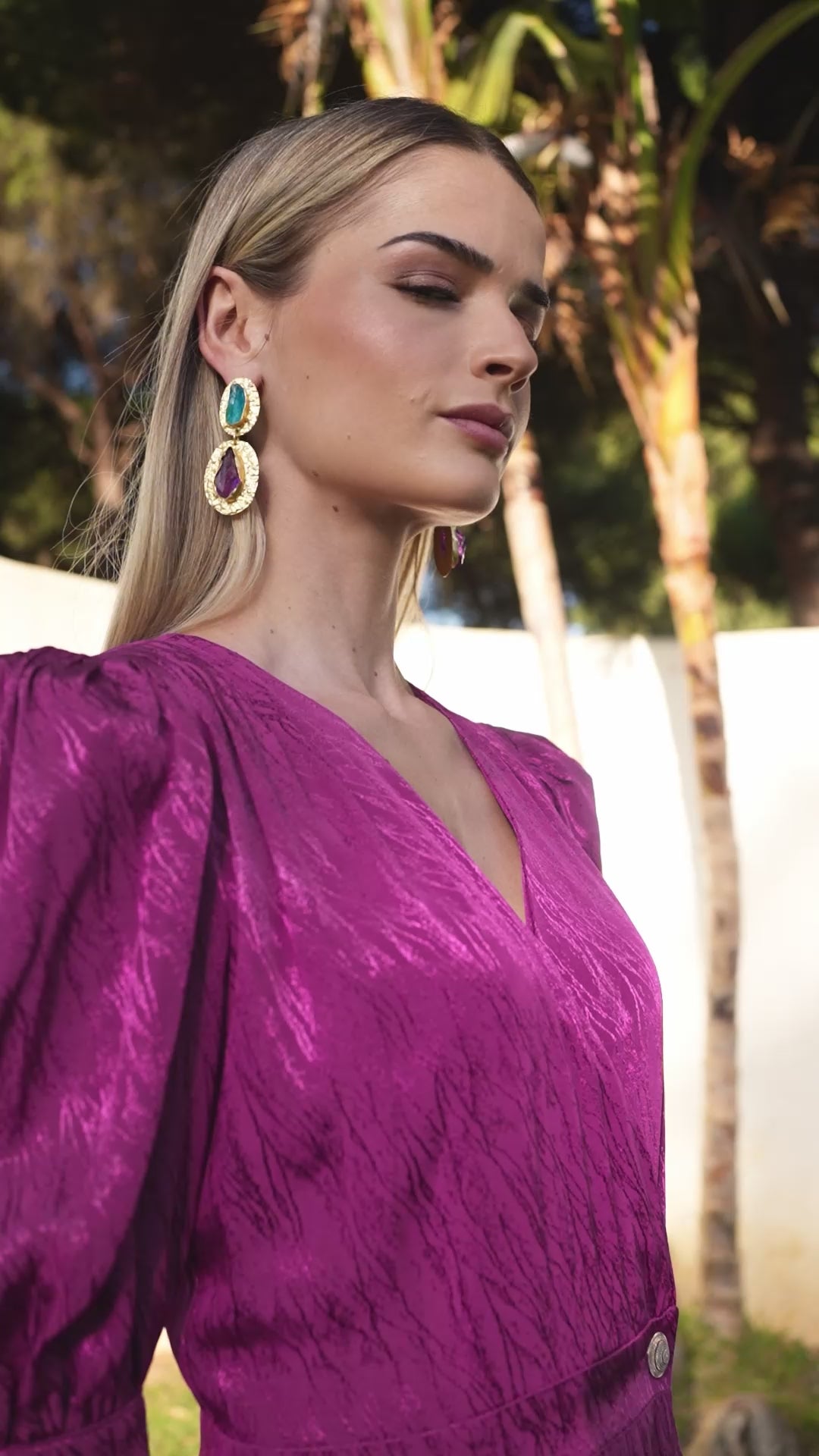 Vestido midi KATHERINE confeccionado en viscosa con caída color vino. El corte envolvente combinado con las mangas abullonadas dotan a este vestido de elegancia y romanticismo. El escote en pico cruzado realza y ajusta la figura. Sus mangas tres cuartos proporcionan estructura y sofisticación. El par de botones dorados en la cinturilla ayudan a mantener la armonía de la prenda. Ideal para madres de comunión.