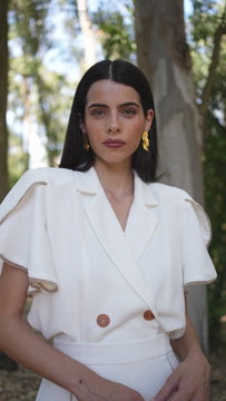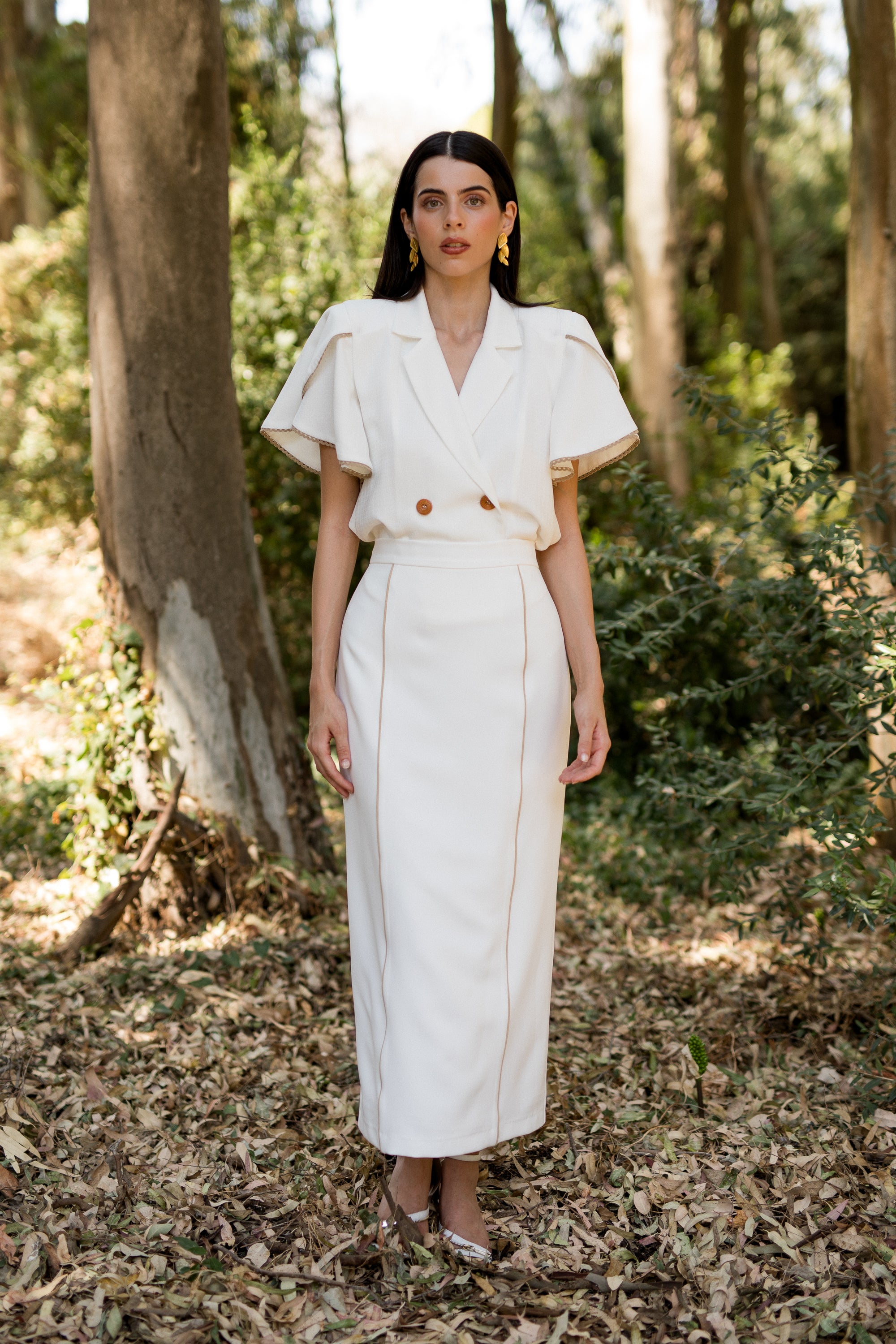 Conjunto midi MARYLIN confeccionado en jacquard pata de gallo. Diseño cruzado formal y elegante con detalles color camel. Su escote de pico y cuello de solapa proporcionan estructura y sofisticación a la prenda. Hombreras marcadas, mangas fluidas con corte mariposa y cinturilla ajustada para otorgar movimiento. Cierre con botones imitación madera que captan toda la atención de esta maravillosa pieza. Una prenda para innumerables ocasiones.