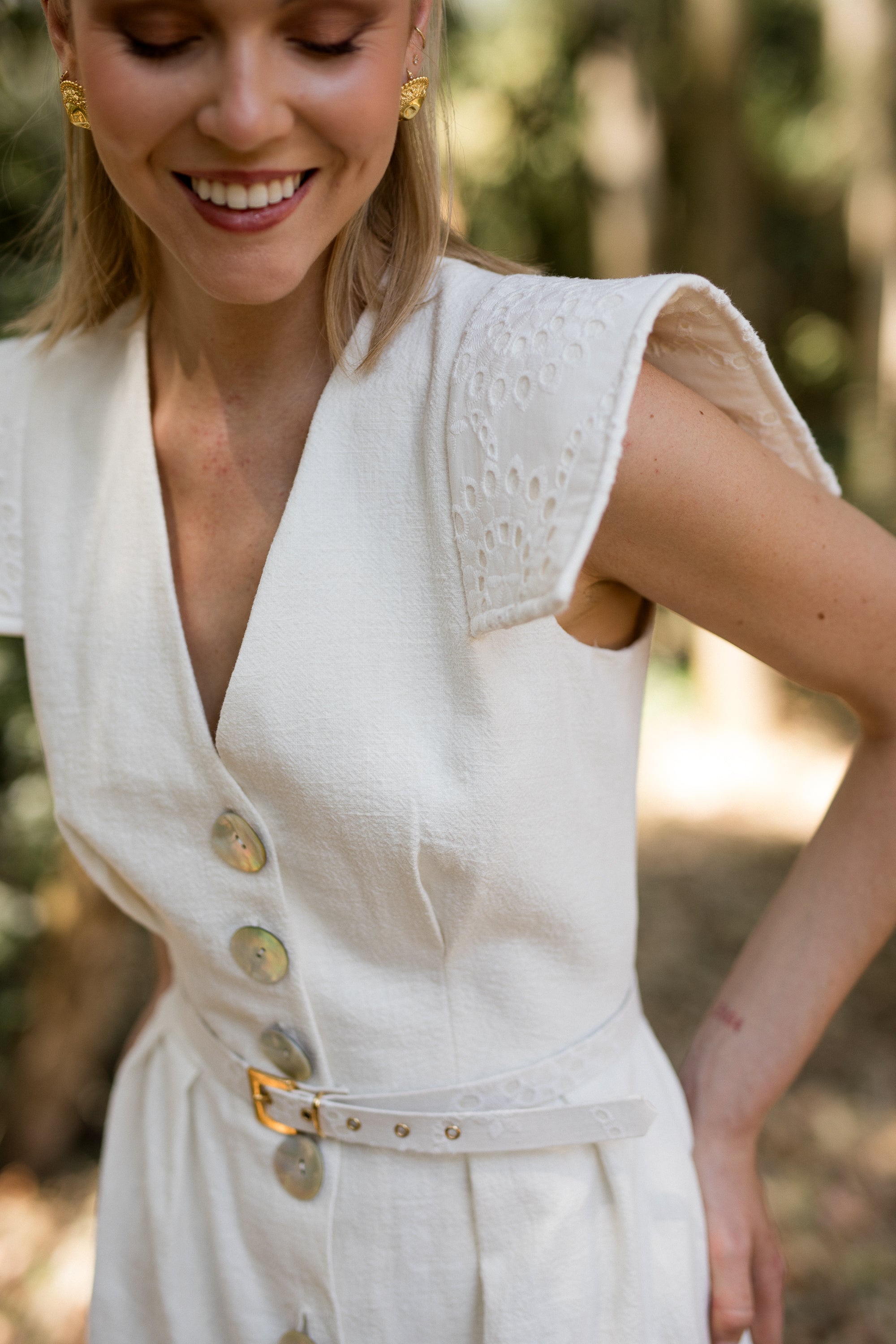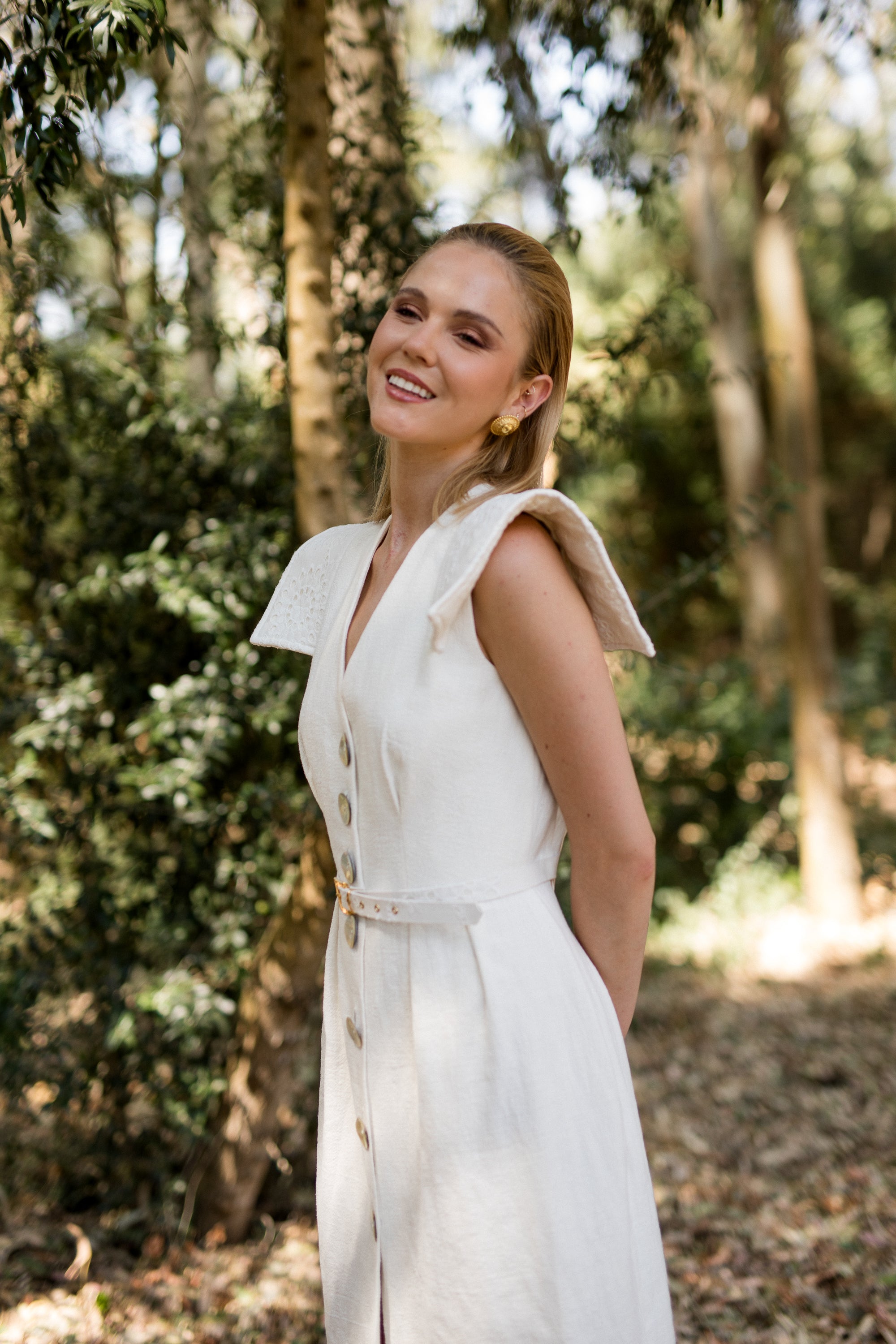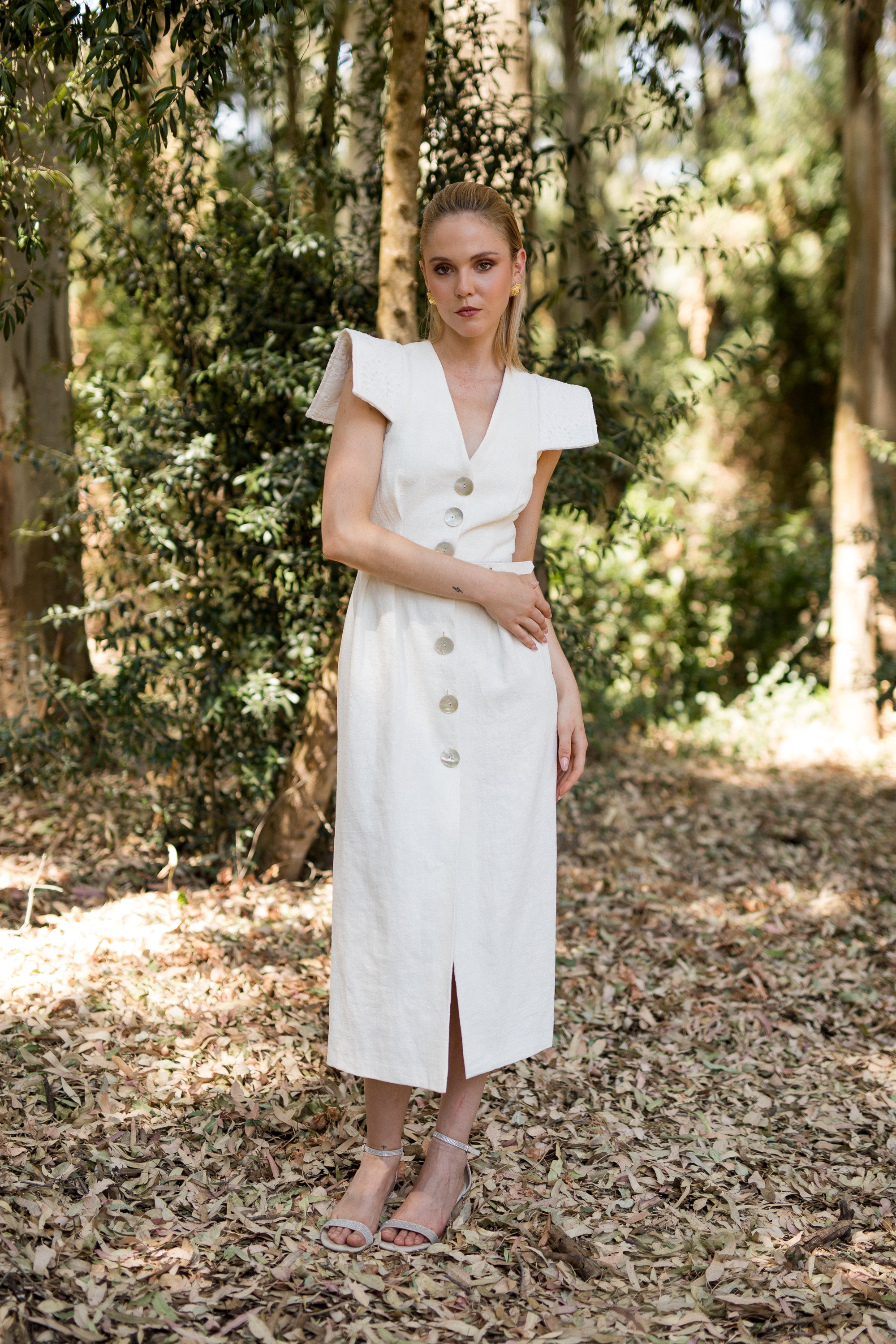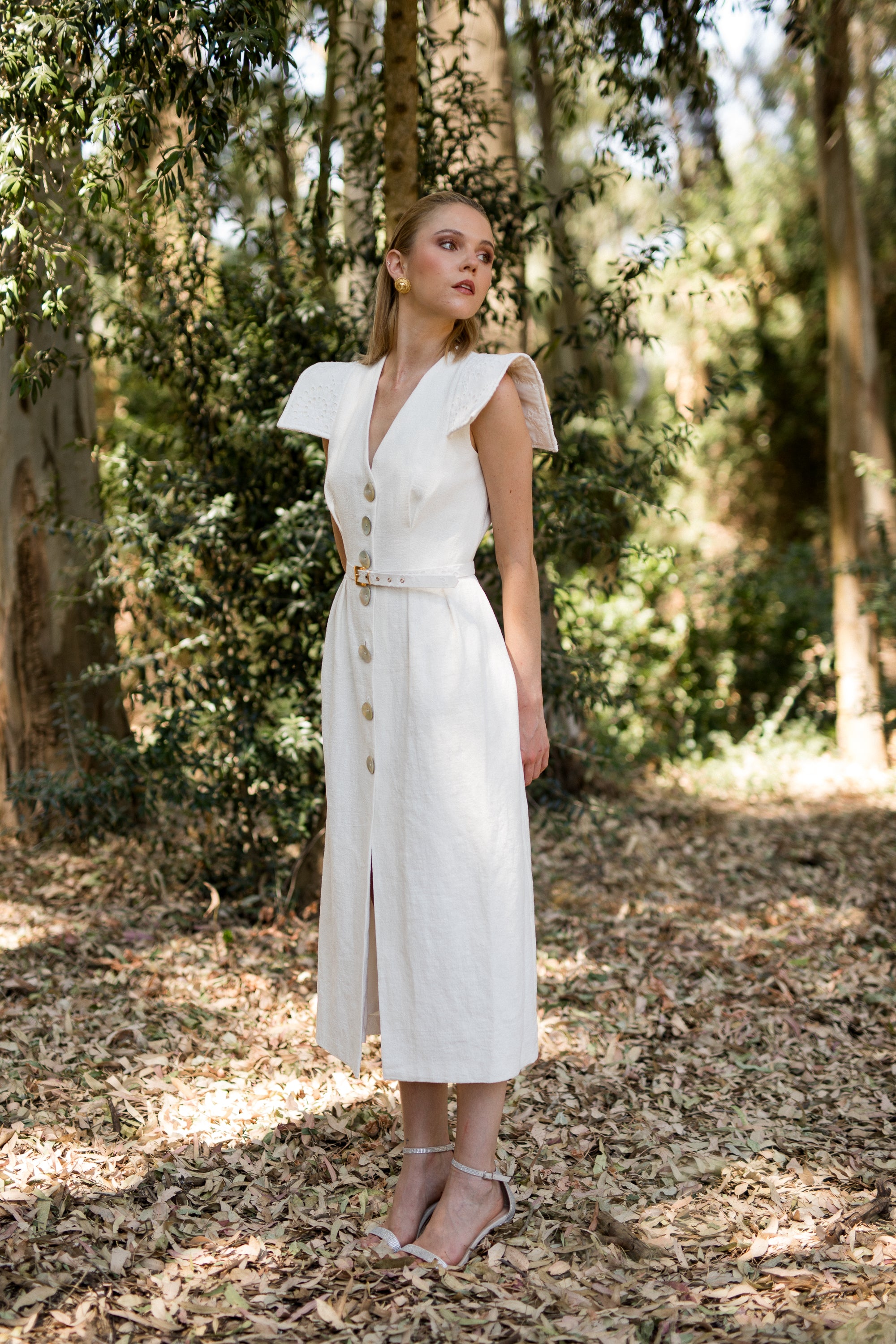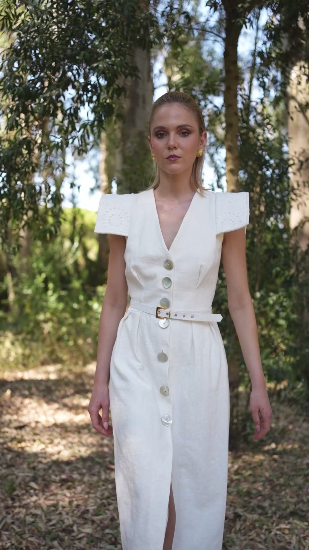 Vestido de invitada ANN, estilo femenino y elegante. Presenta un favorecedor escote en pico con botones frontales y sin manga y aleron que le aporta un toque romántico. Su cintura es ajustada con un cinturón del mismo tejido, que estiliza la silueta, mientras que la falda recta de largo midi crea un look sofisticado y versátil. Ideal para eventos de día, ocasiones especiales o para elevar un look casual con aire chic.
