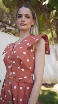 Vestido de invitada ANN, estilo femenino y elegante. Presenta un favorecedor escote en pico con botones frontales y sin manga y aleron que le aporta un toque romántico. Su cintura es ajustada con un cinturón del mismo tejido, que estiliza la silueta, mientras que la falda recta de largo midi crea un look sofisticado y versátil. Ideal para eventos de día, ocasiones especiales o para elevar un look casual con aire chic.