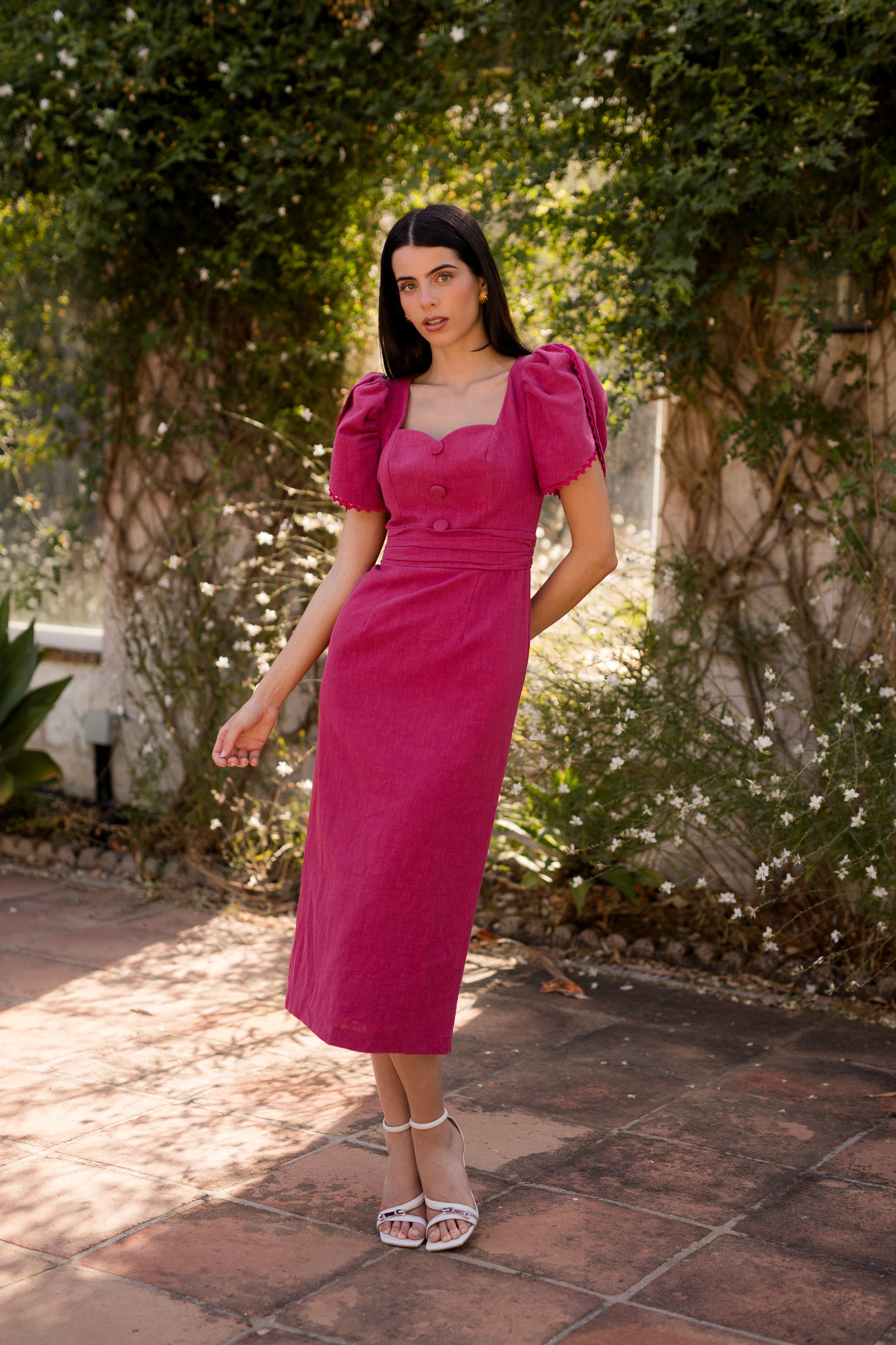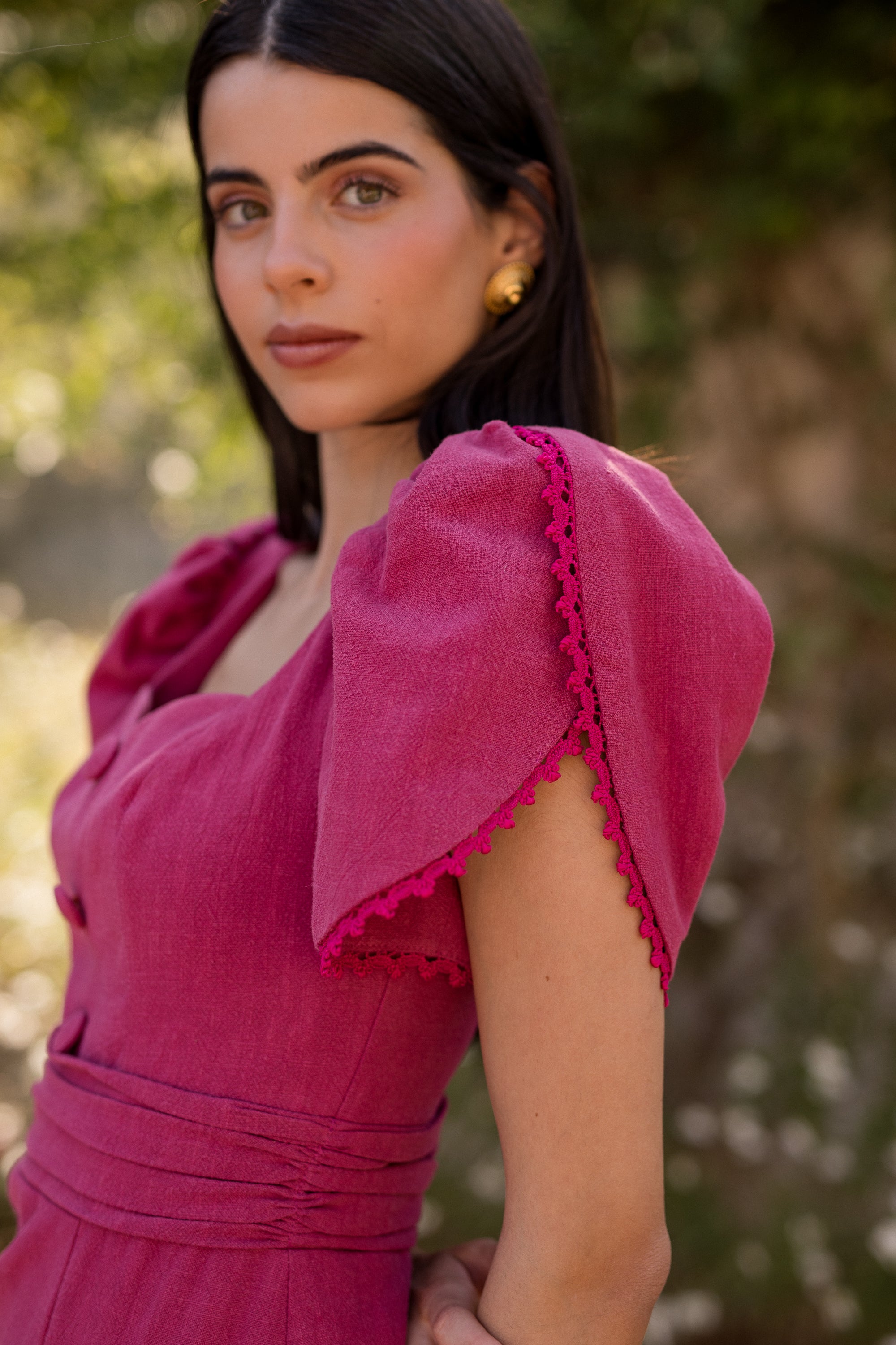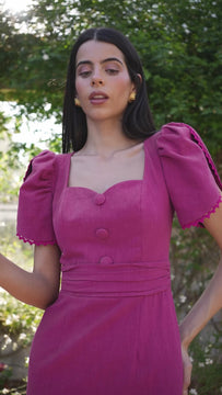 Vestido midi GRETA confeccionado en lino algodón color vino. Diseño romántico con escote de corazón y cinturilla fruncida ajustada. Sus mangas de corte mariposa aportan volumen a la prenda sin perder la elegancia. Detalle de tres botones frontales forrados del mismo tejido y abertura posterior que armonizan la estructura de la pieza. Ideal para nuestras clientas más sofisticadas.