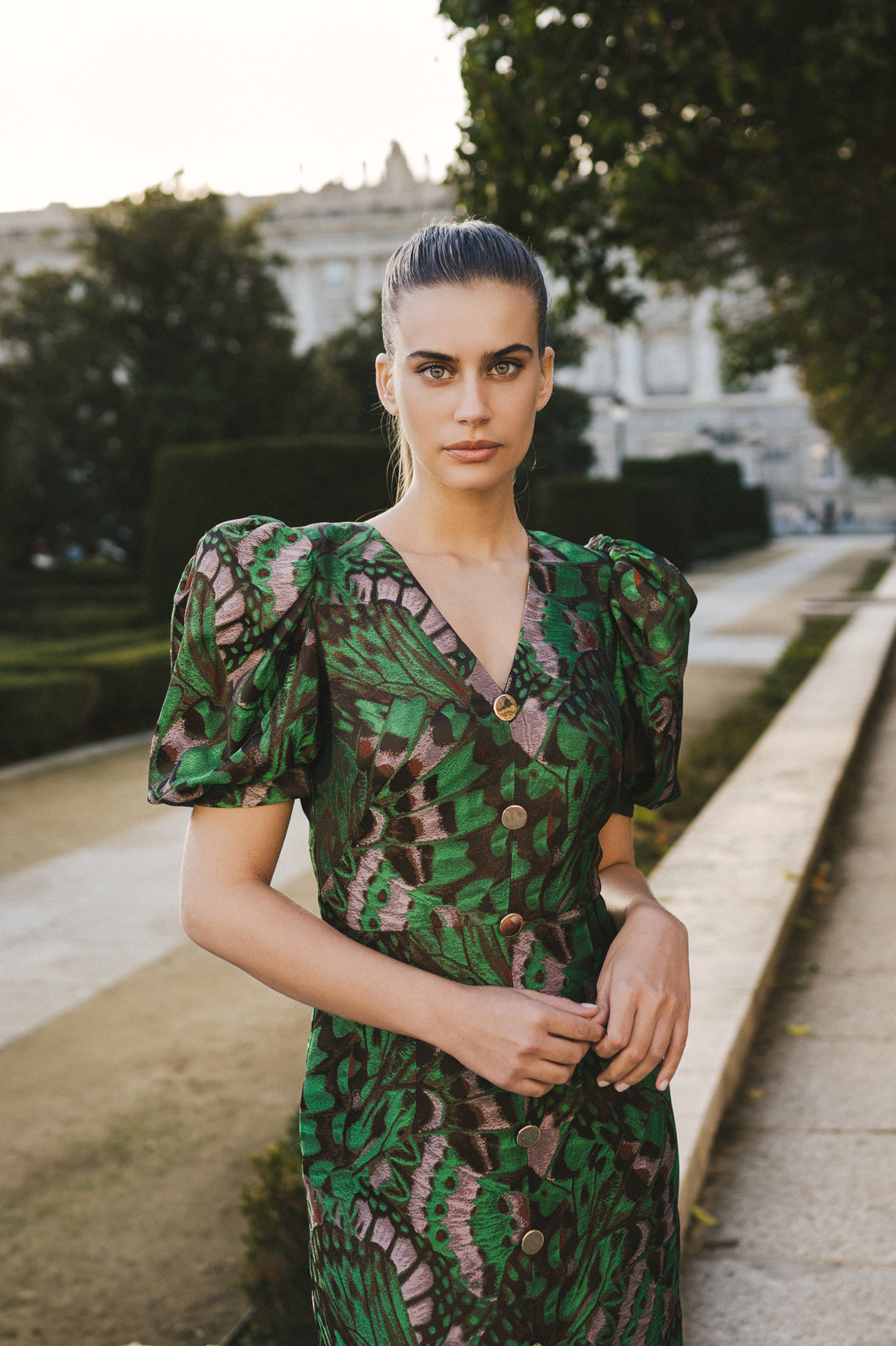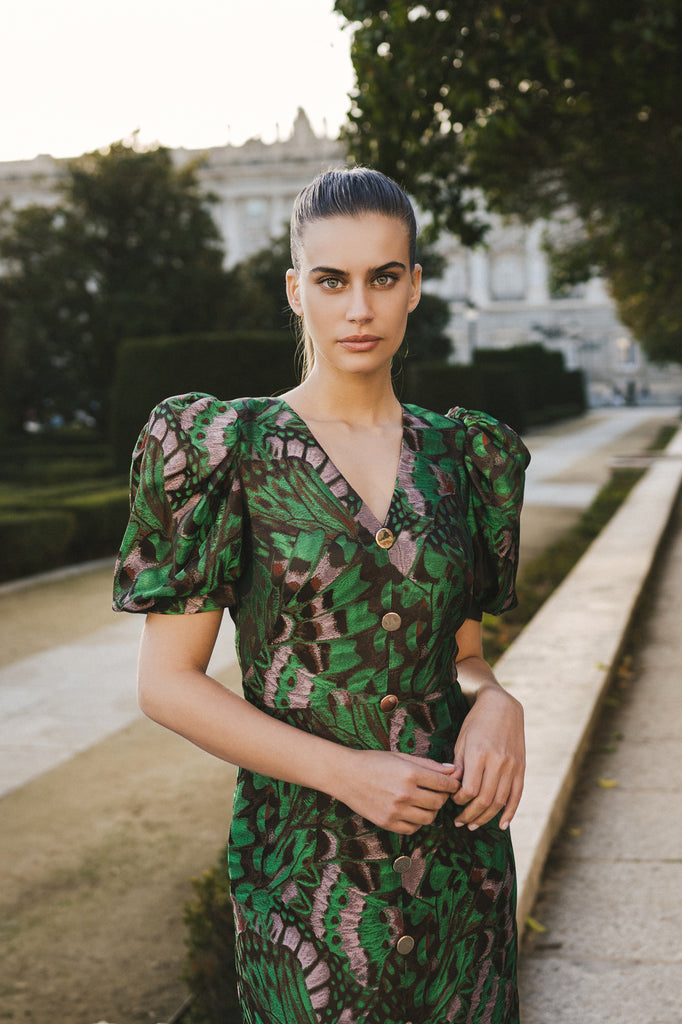 Este vestido, confeccionado en jacquard verde, es una opción imprescindible para las invitadas de boda o eventos especiales. Se distingue por sus mangas abullonadas y un escote en V. Los botones frontales añaden un detalle elegante. Perfecto para quienes buscan destacar con un look elegante y memorable.
