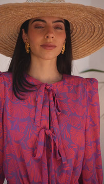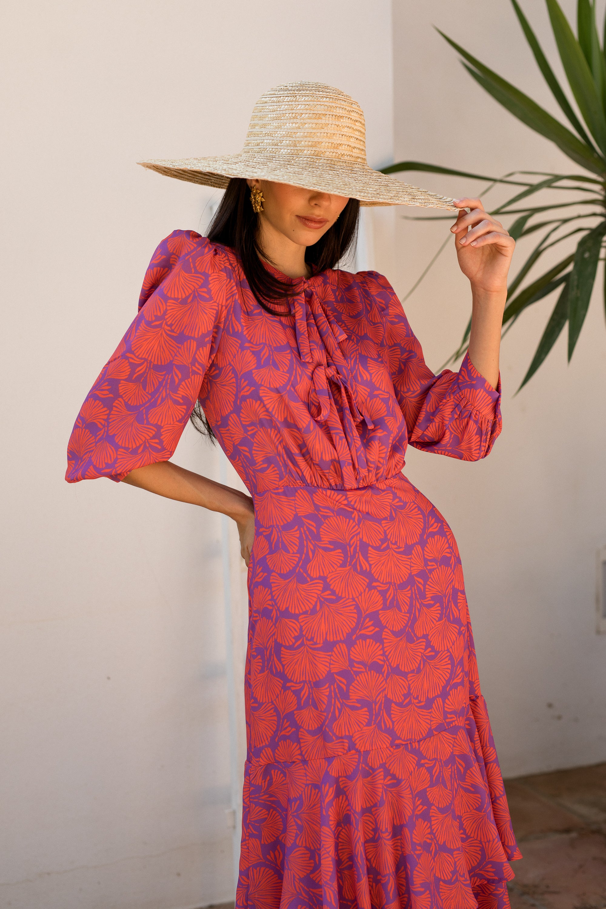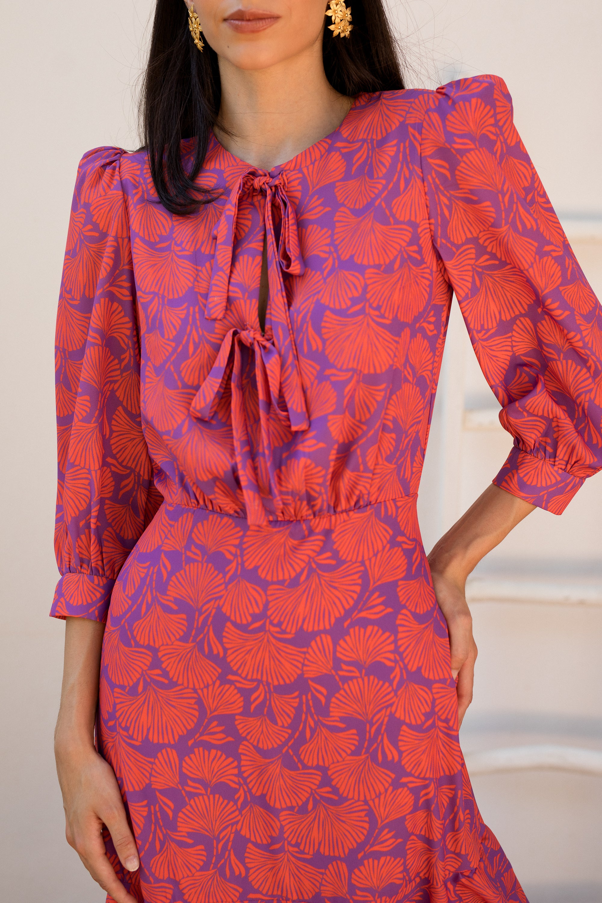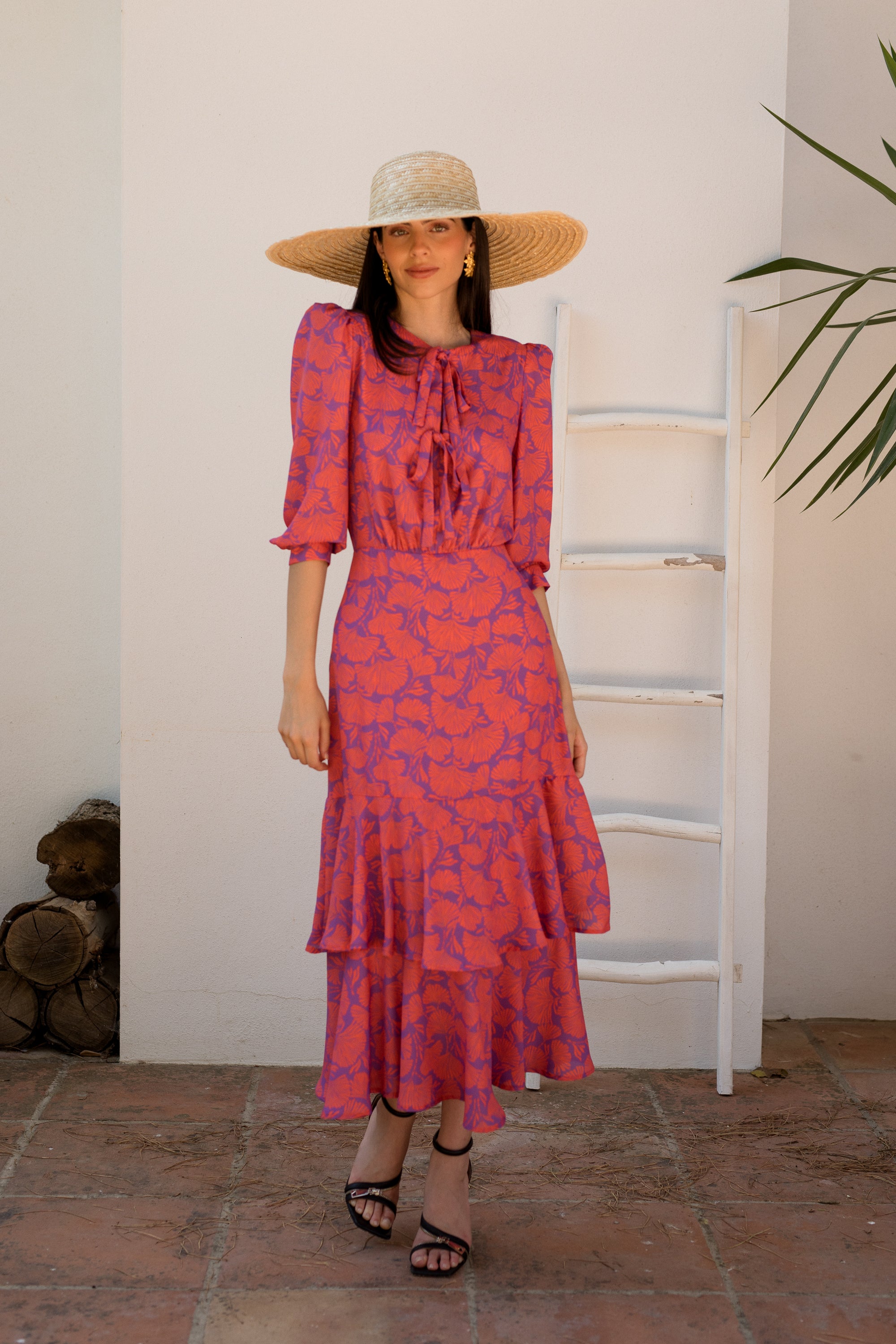 Vestido midi MARLENE confeccionado en georgette con estampado flor. Diseño estructurado compuesto por mangas tres cuartos, hombreras marcadas y cuello redondo. La parte superior de la prenda se ve endulzada con un par de lazos relajados en la zona frontal, mientras que la parte inferior se ve estilizada con la ayuda de dos volantes amplios que proporcionan caída, volumen y movimiento. Se trata de un vestido primaveral perfecto para cualquier evento de día.
