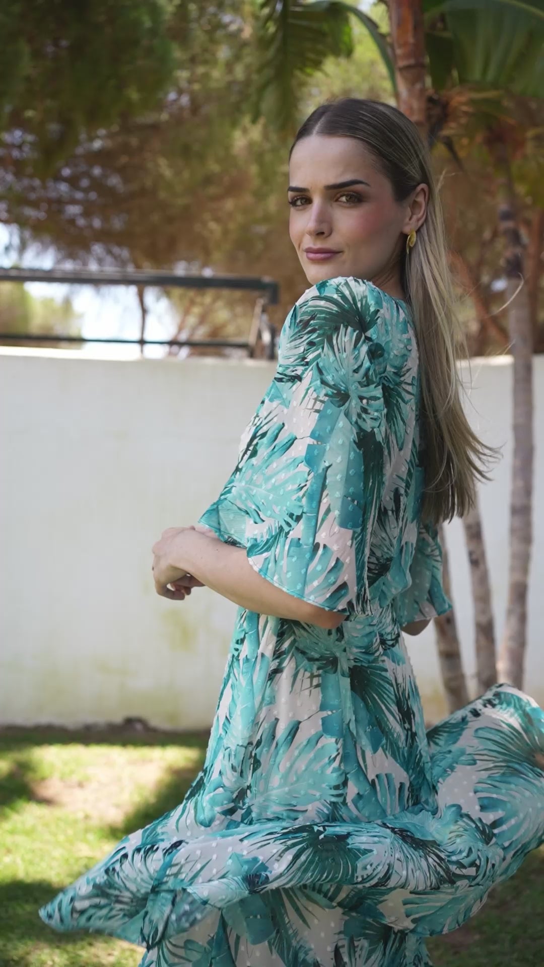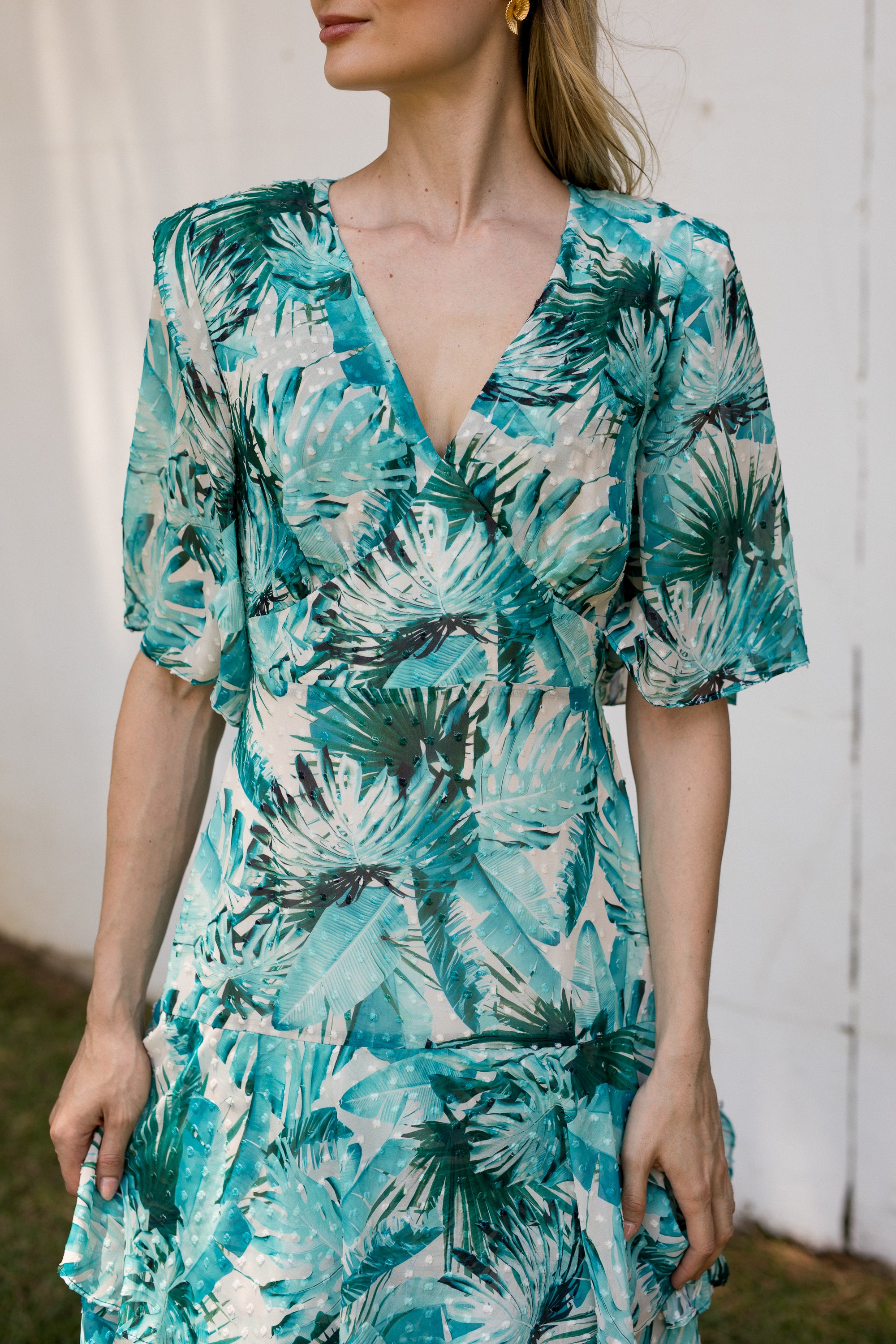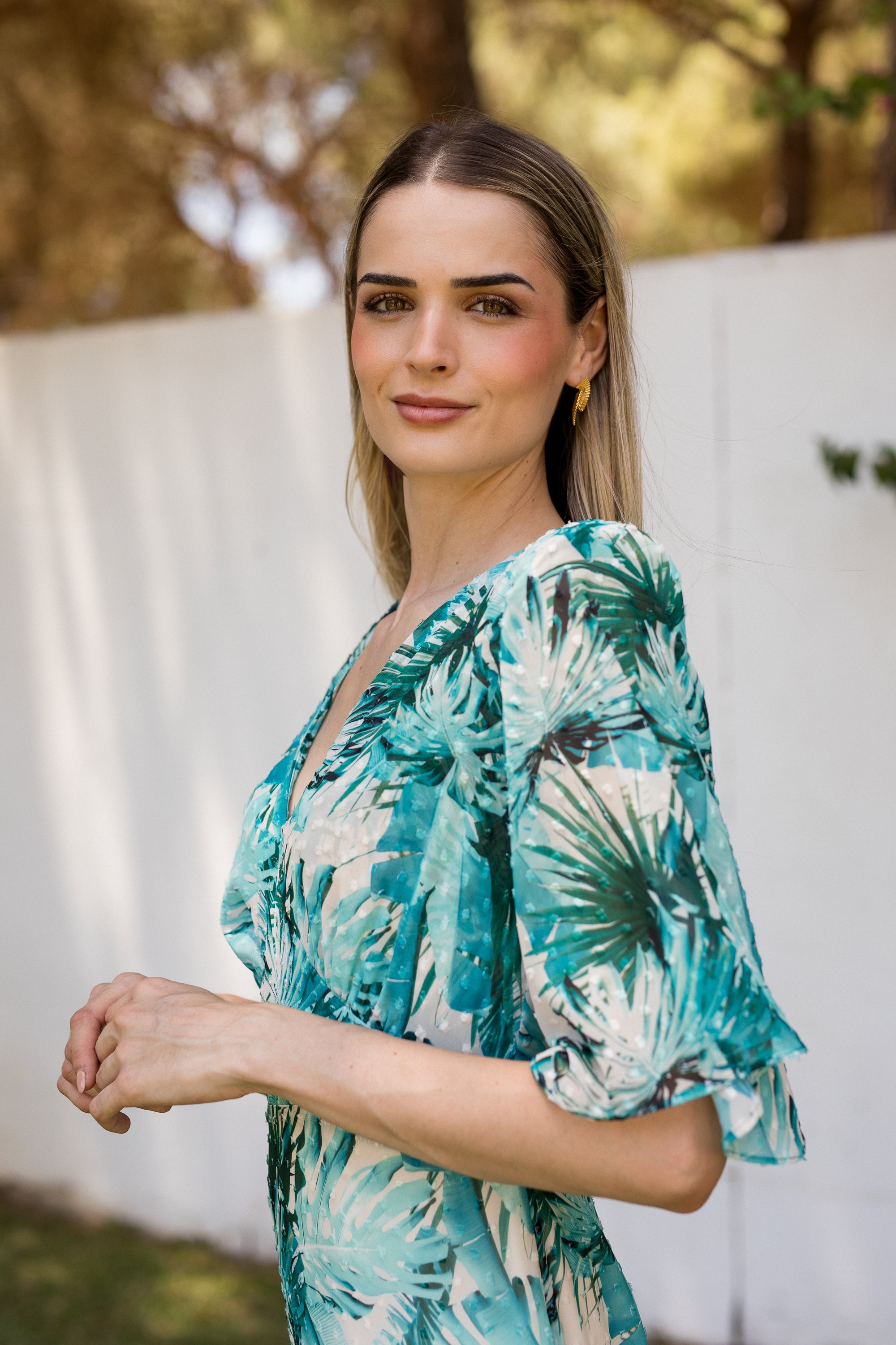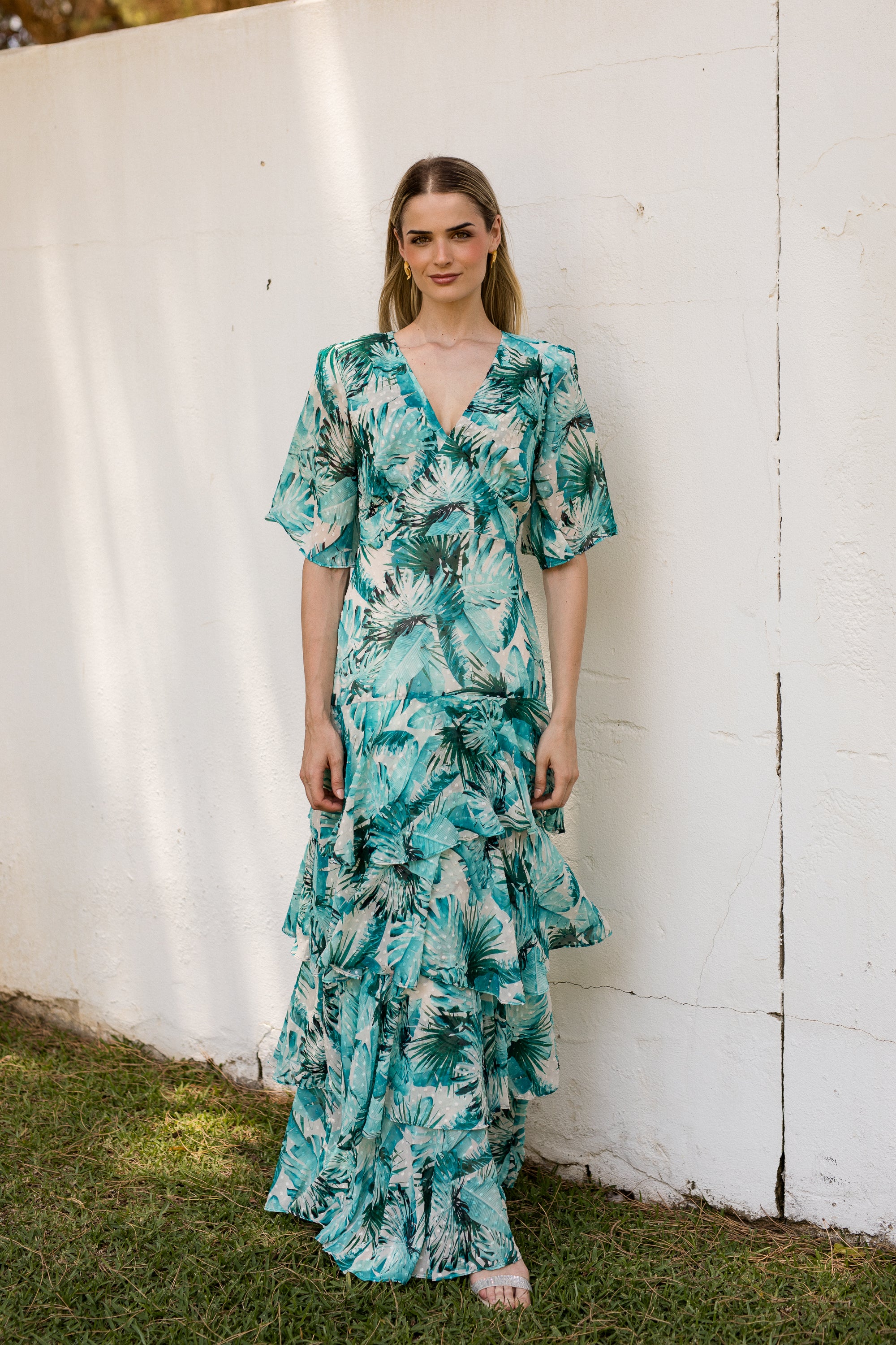 Vestido largo BRIGITTE confeccionado en georgette con estampado de palmeras. Diseño elegante con escote en V, hombreras marcadas, mangas con campana corta y cuerpo medio ajustado. En la parte inferior del vestido nos encontramos cuatro volantes que proporcionan caída y que captan toda la atención en el movimiento. Con este vestido ningún paso pasará desapercibido. La opción perfecta para invitadas de boda esta primavera.