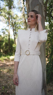 Vestido midi KIM confeccionado en jacquard lurex rombos. Diseño que combina una pieza plana con una estructura en V en la parte superior. Manga tres cuartos con hombreras marcadas visibles que ayudan a estilizar y estructurar la prenda. Hilera de botones frontales que proporcionan suavidad a la forma de cuello mao. El detalle del cinturón potencia la figura y marca la silueta. La sencillez como sinónimo de elegancia. Ideal para bautizos y comuniones de primavera.