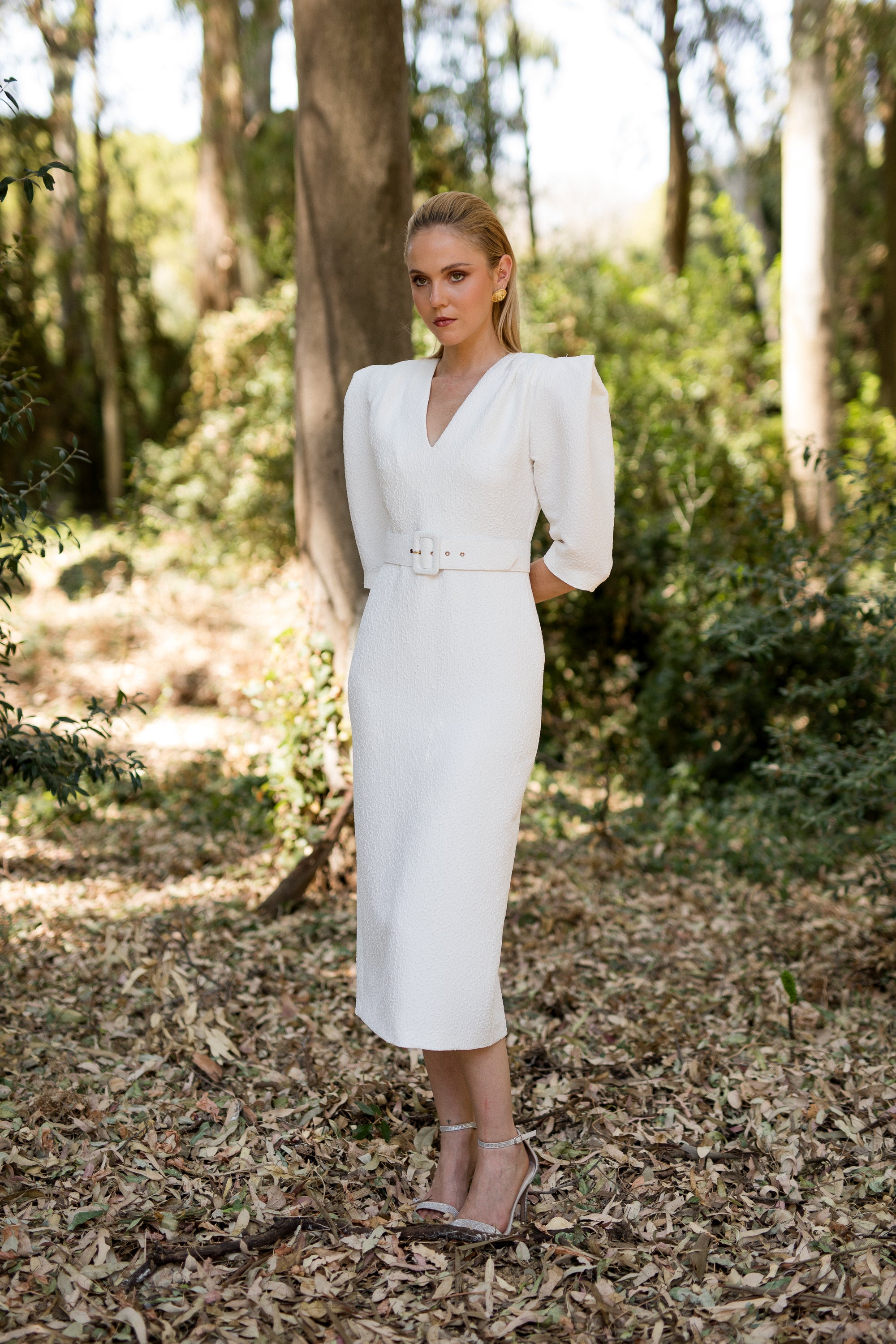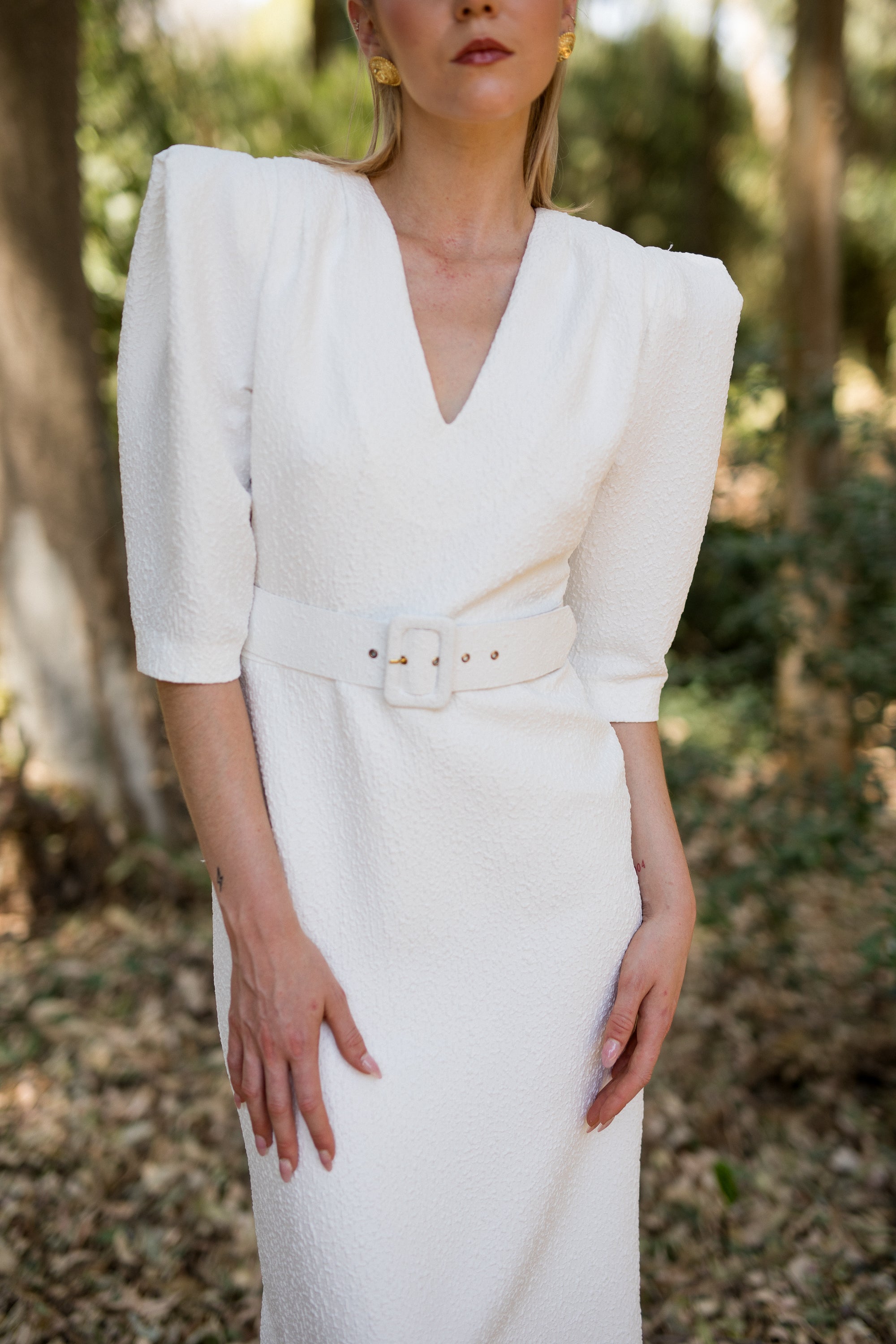 Vestido midi DOROTHY confeccionado en jacquard rústico. Diseño elegante y minimalista que resalta por su escote en pico, sus mangas tres cuartos y sus hombreras marcadas. El cinturón está recubierto del mismo jacquard rústico del que se confeccionó el vestido, por lo que se integra a la perfección con el mismo y ayuda a armonizar la silueta de forma sutil y armónica. Es perfecto para mamás de comunión.