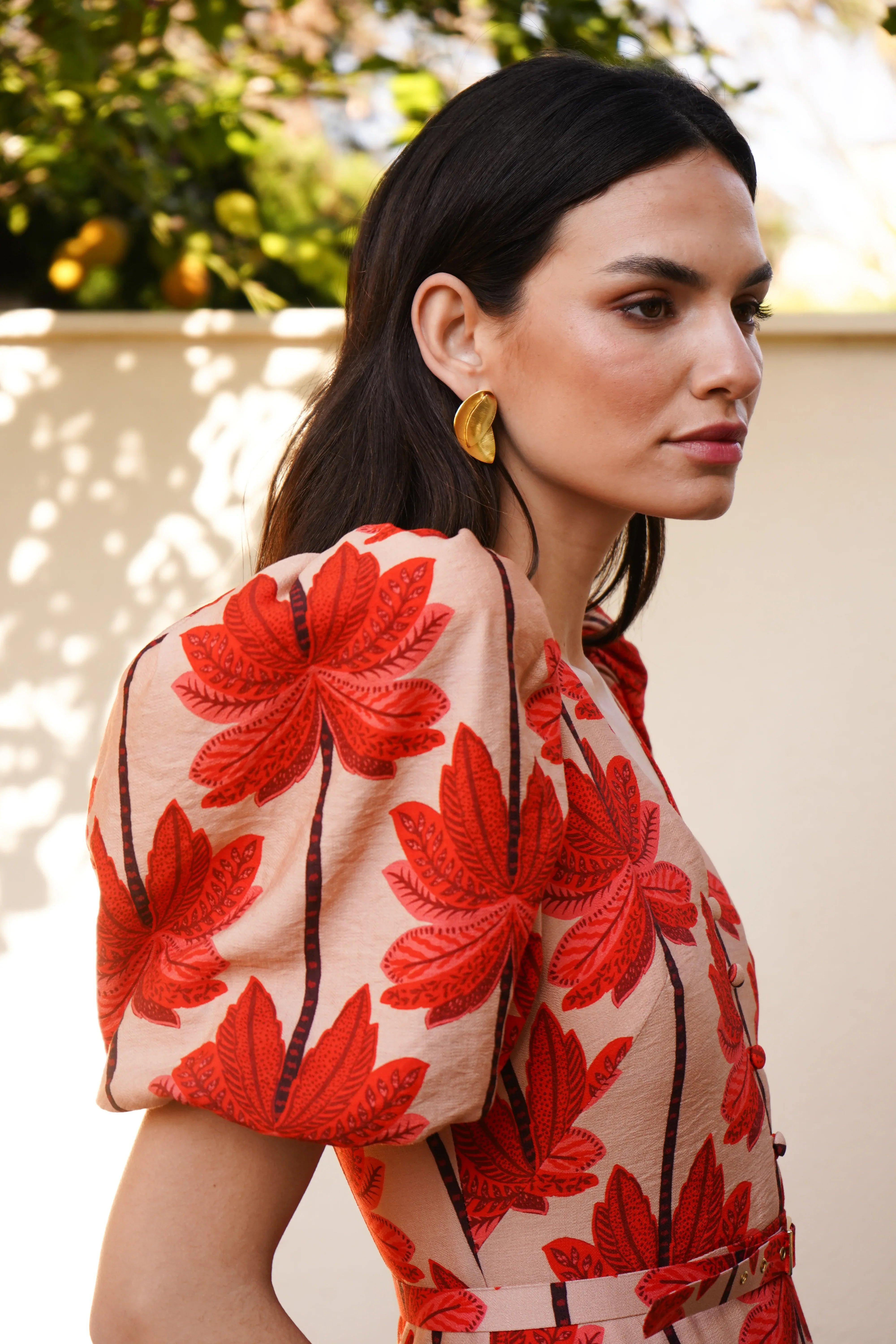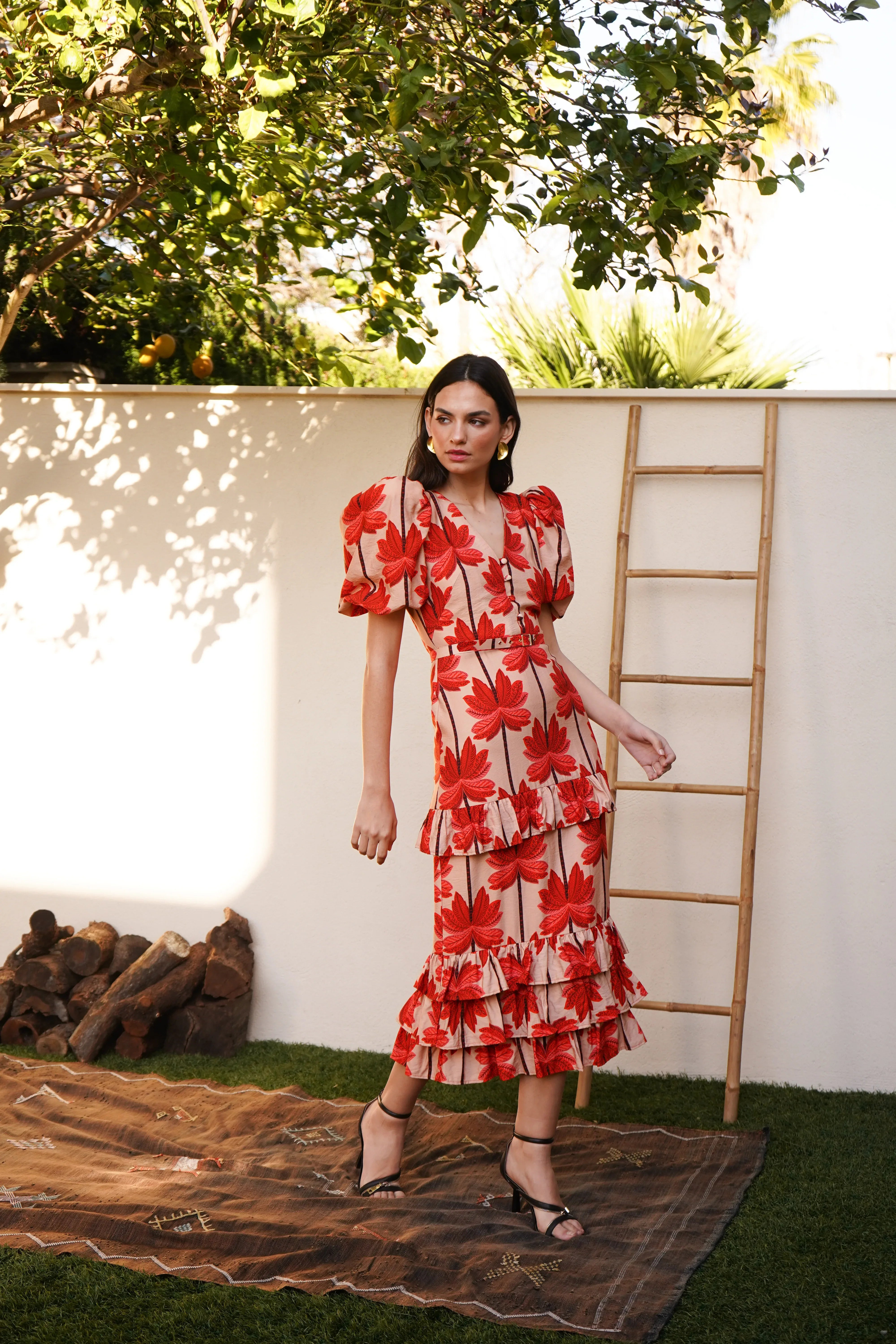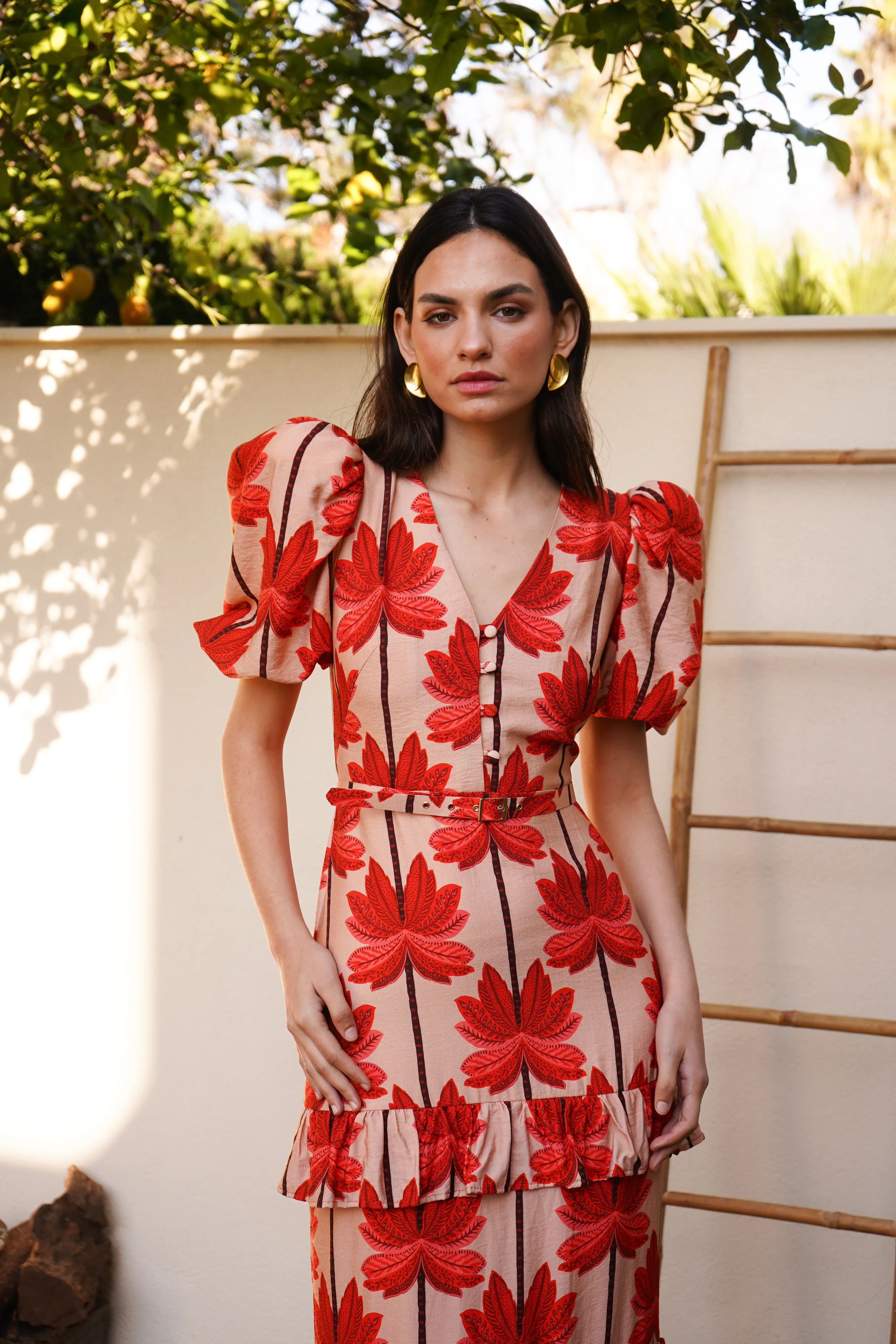 Vestido midi DORIS confeccionado en lino estampado palmera. Diseño elegante con mangas abullonadas y escote en pico. Los volantes aportan originalidad, el volante más alto ayuda a estilizar la figura, mientras que los tres volantes situados al borde aportan caída y firmeza. El detalle del cinturón reafirma y marca la cinturilla, ayudando de forma proporcional a la estructura de la prenda. Ideal para invitadas de día.